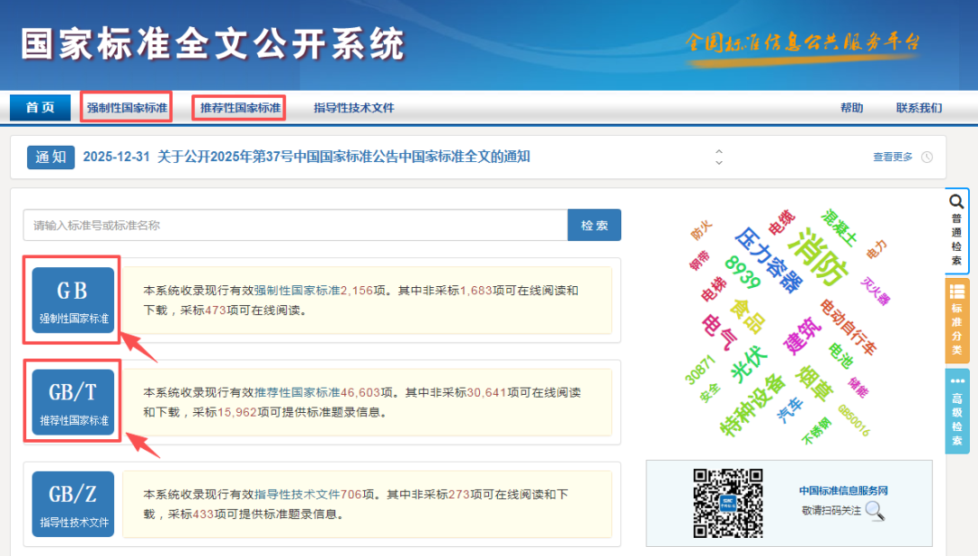 1.在页面导航条选择“强制性国家标准”或“推荐性国家标准”类别标签,查询相应类别的标准。